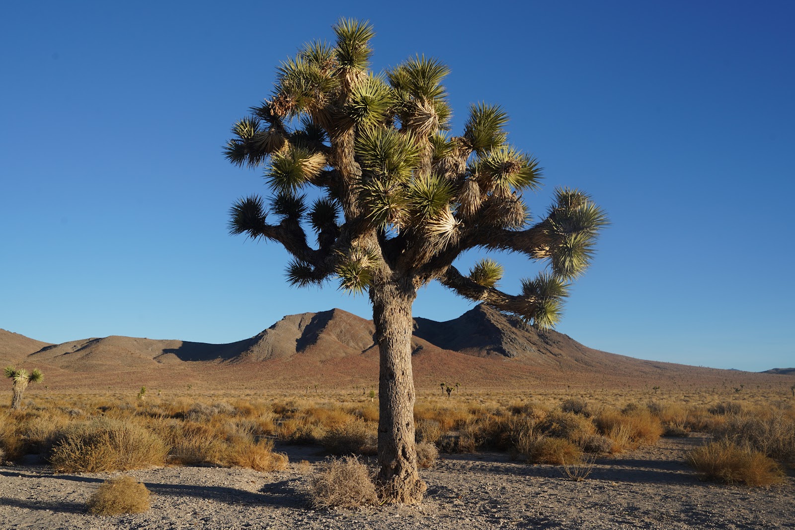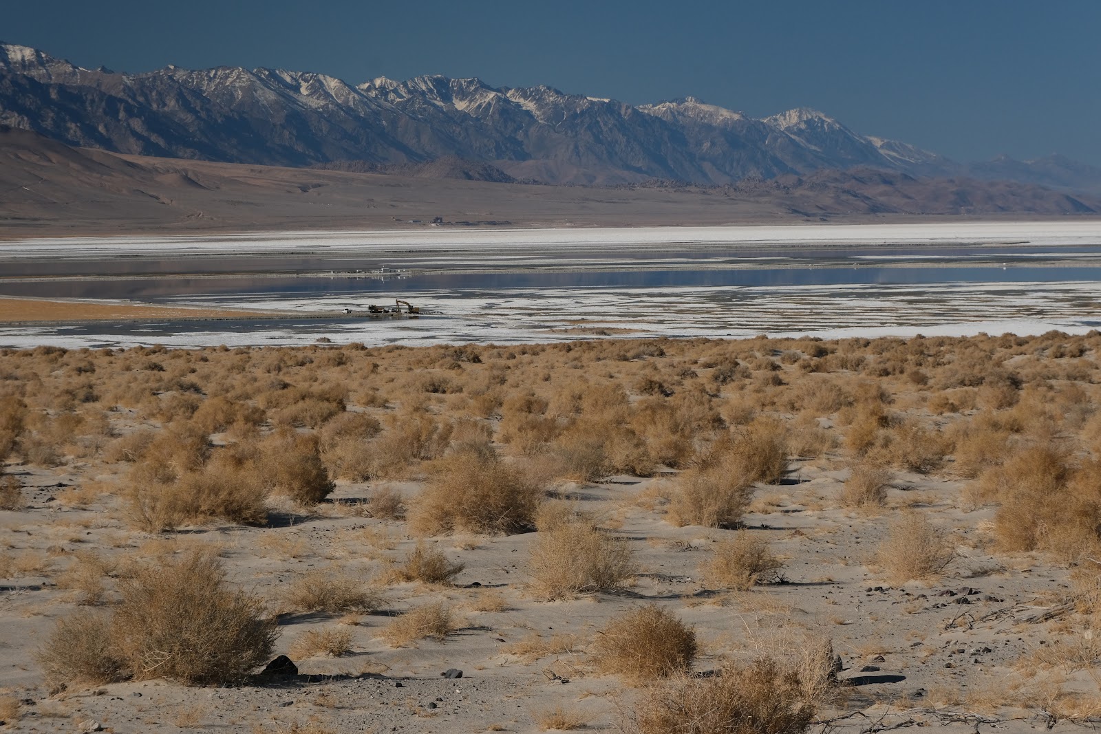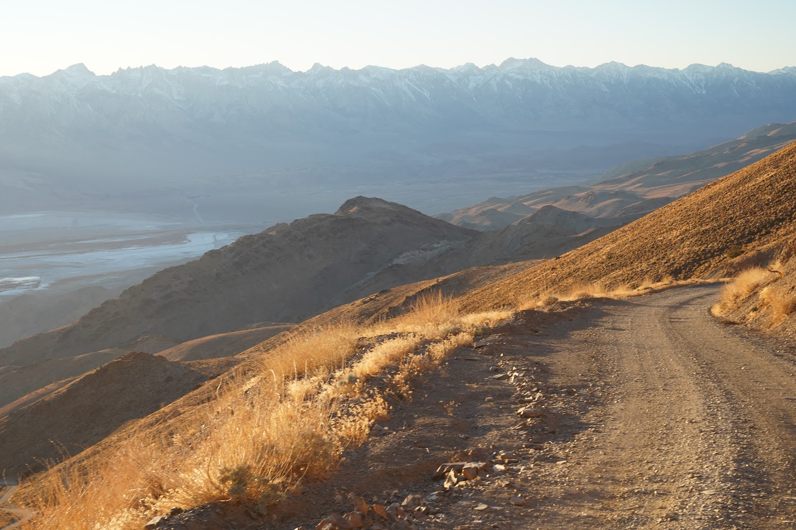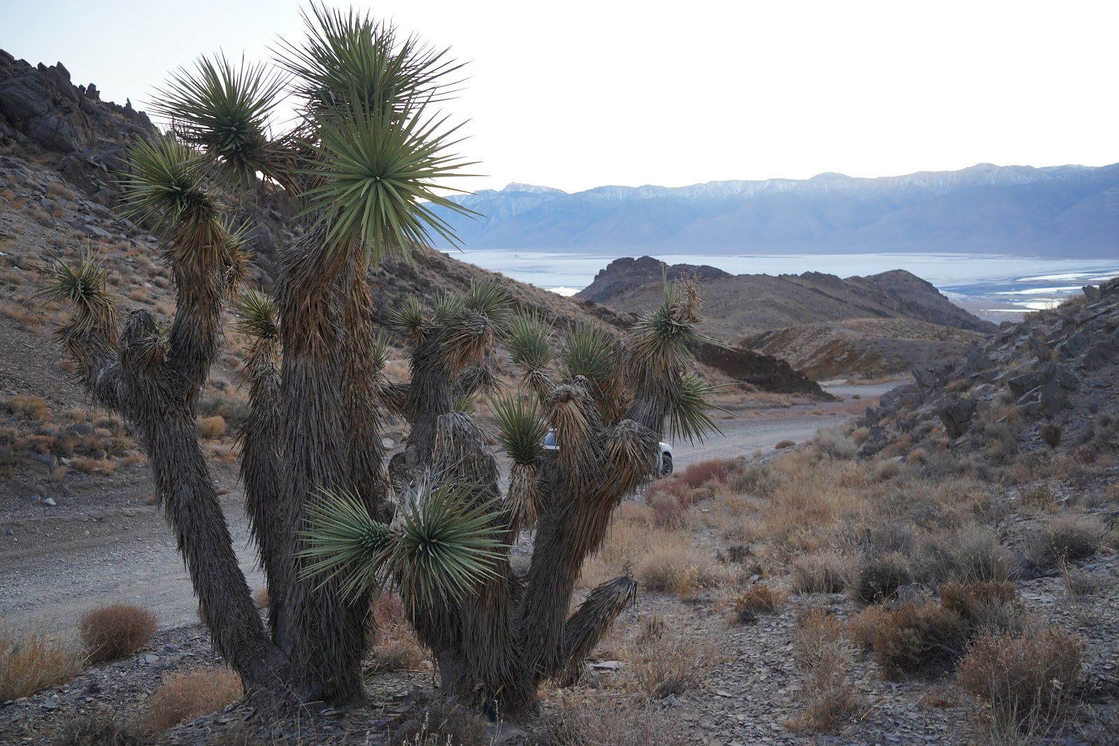 Die Panoramastraße bietet einen wunderschönen Blick auf den Owens Lake mit dem schneebedeckten Gipfel der Sierra Nevada im Hintergrund. Alles hier ist stachelig. Im Vordergrund stehen Josua-Bäume wie Statuen eines stacheligen Geistes. Die Wiesen sind mit kargem, blattlosem, stacheligem Gestrüpp bedeckt. Die Hänge sind mit scharfkantigen Felsen übersät.
