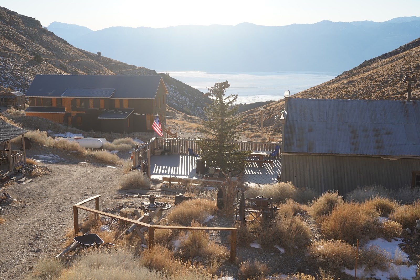 Nachdem der Bergbau in Cerro Gordo 1957 endgültig eingestellt wurde, musste ein Hausmeister den langsamen Verfall der Gebäude beobachten. Übrig geblieben sind die Überreste von einem halben Dutzend Gebäuden, einer Kirche, aber auch einige Gebäude, die recht neu aussehen. Eines der Gebäude wird als Museum genutzt. Ein begeisterter Freiwilliger, der auf der Plattform am Eingang in der Sonne sitzt, gibt uns eine Einführung. Die gesamte Geisterstadt wurde 2018 von Brent Underwood und einigen Investoren für 1,4 Millionen gekauft. Leider brannten drei der Gebäude bald nieder. Eines der restaurierten Gebäude wird vom Eigentümer während seiner Besuche als Wohnhaus genutzt. Ein anderes dient den Freiwilligen, die für die Restaurierung arbeiten, Führungen anbieten und den Souvenirladen betreiben. Das größte Gebäude soll zu einem Hotel umgebaut werden. Unser Führer zeigt uns Fotos, wie sie eine riesige Klärgrube den Berg hinaufgeschleppt haben. Die Eigentümer haben einen YouTube-Kanal eingerichtet, um über den Fortschritt des Projekts zu berichten.