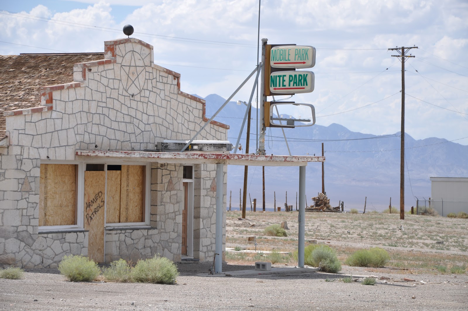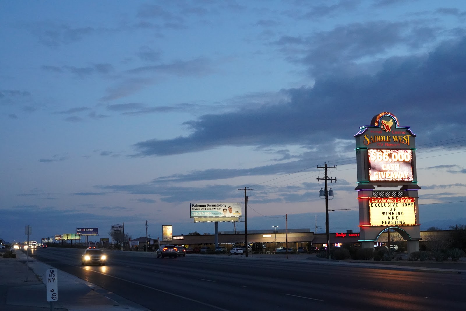 Für unsere nächste Nacht steuern wir ostwärts durch eine völlig leere Landschaft in Richtung der Metropole Pathrump, Nevada. Mitten in einer wüstenähnlichen Landschaft wurde durch Bewässerung eine gesichtslose Metropole aus der Wüste herausgearbeitet. Die Wohnviertel scheinen sich um Golfclubs zu gruppieren. Alle öffentlichen Plätze sind von riesigen Parkplätzen umgeben. Dieser Ort ist nicht nur ungeeignet für Fußgänger und Radfahrer, sondern macht auch misstrauisch, wenn man nicht mit dem Auto unterwegs ist. Es gibt weder Bürgersteige noch sinnvolle öffentliche Verkehrsmittel. Das Überqueren der breiten Durchgangsstraßen ist geradezu selbstmörderisch.