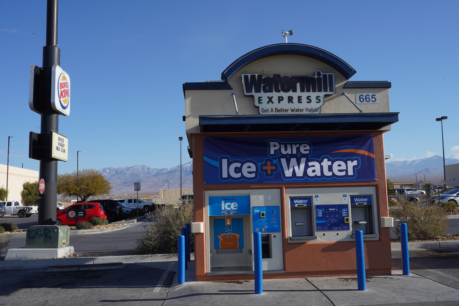 Auf dem Parkplatz gibt es einen Automaten, an dem man Eis und Wasser kaufen kann. Der Wassermühlen-Express. Woher kommt das Wasser für all die Golfclubs, mehrere Duschen pro Bewohner und Tag, Pools und die Bewässerung der öffentlichen Plätze und privaten Gärten?