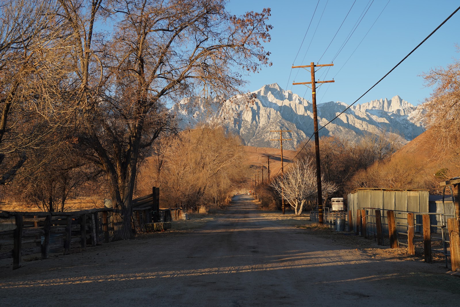 Als ich aufstehe und einen Morgenspaziergang mache, ist die Luft frisch und der Himmel blau. Die Sierra Nevada scheint direkt über mir zu schweben. Die hohen Berge, darunter der Mount Whitney, sind schneebedeckt. Die Spuren von Nebenstraßen sind zu sehen, die sich kreuz und quer die steilen Hänge der Vorgebirge hinaufziehen. Obwohl einige Wohnstraßen parallel zur Hauptstraße verlaufen, bin ich nach einem kurzen Spaziergang mitten in der Natur. Ein Pferd schnauft neugierig. Hähne krähen. Das trockene Gras und die restlichen Blätter in den Bäumen rascheln in der leichten Brise.