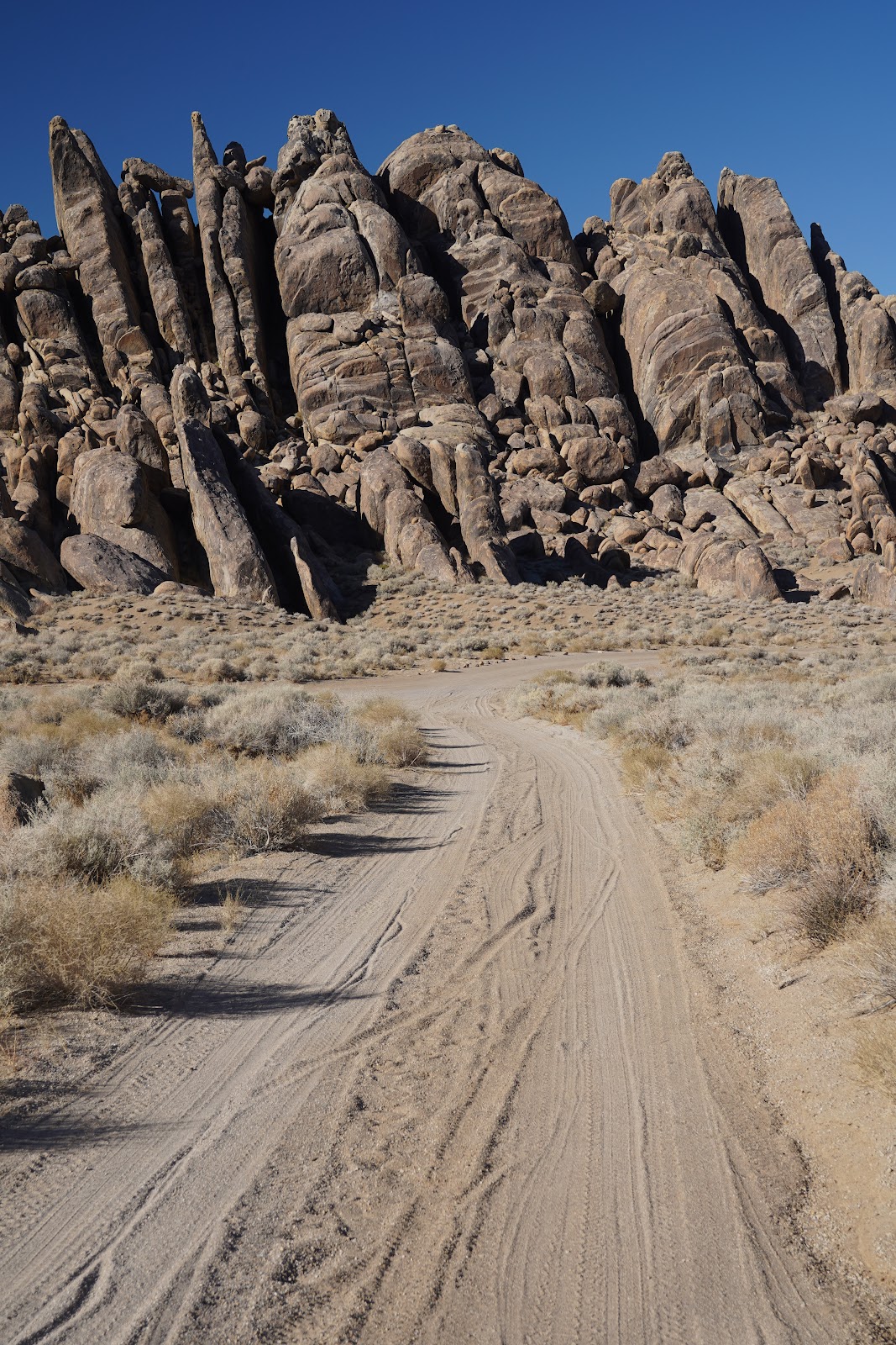 Die Nutzung von Campingplätzen in den Alabama Hills ist streng geregelt. Kleine Schilder zeigen deutlich an, wann Plätze nur für Tagesgäste reserviert sind. Die meisten sind es auch. Mein Freund W. ist angewidert. Das war früher nie so. Es ist fraglich, ob sich die Leute überhaupt für die Schilder interessieren. Wir machen zwei Jungs eine Bemerkung, die gerade ihr Lager um zwei riesige Pick-ups herum aufschlagen. Sie zucken mit den Schultern. Etwas weiter oben, am nördlichen Ende der Alabama Hills, bietet einer der Tagesplätze einen scheinbar endlosen Blick auf das Owens Valley, das zwischen den hohen Bergen zu beiden Seiten verschwindet. Die Vegetation besteht, wenn überhaupt, hauptsächlich aus hüfthohem Buschwerk.
