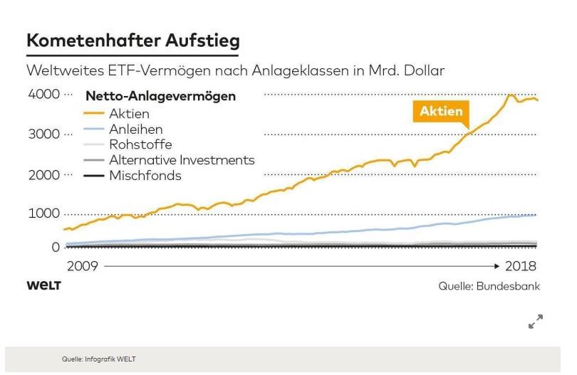 Die Risiken der Indexmärkte aber liegen nicht nur bei den Privatanlegern, sondern eben auch und darüber hinaus als ein Risikofaktor über der gesamten Finanzwelt. Gleichwohl das weltweite ETF-Vermögen von etwas über 5 Billionen Dollar in den vergangenen Jahren stark zugenommen hat, entspricht es nur knapp 14 Prozent sämtlicher Gattungen von Investmentfonds.