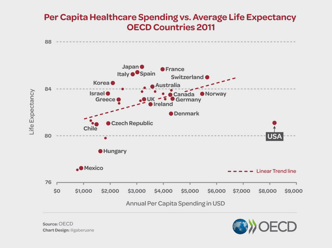 Ca. 15 Prozent der Bevölkerung, und das sind immerhin 48 Millionen Amerikaner, sind überhaupt nicht krankenversichert. Der Grund hierfür ist naheliegend: Viele Amerikaner können sich die Krankenversicherung einfach nicht leisten. In keinem Land der Erde kosten Behandlung und Medikamente nämlich mehr als in den Vereinigten Staaten. Dass hohe Kosten dabei nicht zwingend zu einer besseren Gesundheitsversorgung führen, zeigt eine Auswertung der OECD aus dem Jahr 2011. Vergleicht man die durchschnittliche Lebenserwartung mit den Gesundheitskosten pro Kopf, liegen die USA weit abgeschlagen hinten in diesem Feld2 . Auch die Episode von Obamacare hat an diesem Zustand wenig geändert.